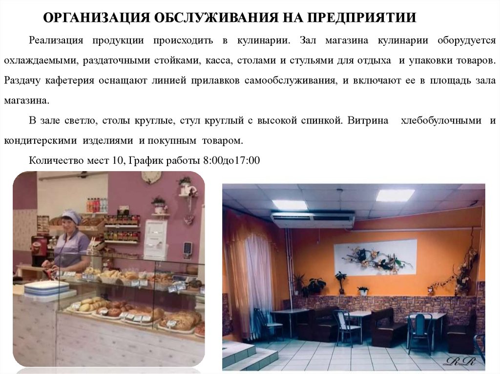 ОРГАНИЗАЦИЯ ОБСЛУЖИВАНИЯ НА ПРЕДПРИЯТИИРеализация продукции происходить в кулинарии. Зал магазина кулинарии оборудуется