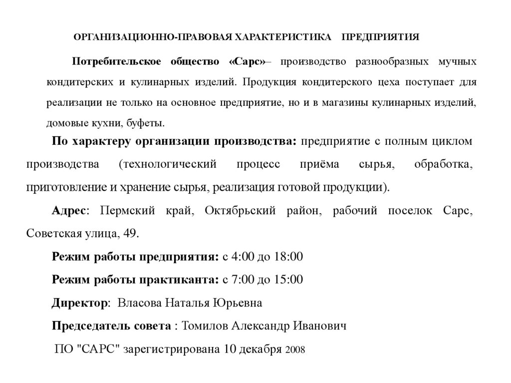 ОРГАНИЗАЦИОННО-ПРАВОВАЯ ХАРАКТЕРИСТИКА ПРЕДПРИЯТИЯПотребительское общество «Сарс»– производство разнообразных мучных