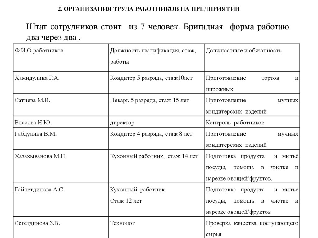 2. ОРГАНИЗАЦИЯ ТРУДА РАБОТНИКОВ НА ПРЕДПРИЯТИИШтат сотрудников стоит из 7 человек. Бригадная форма работаю