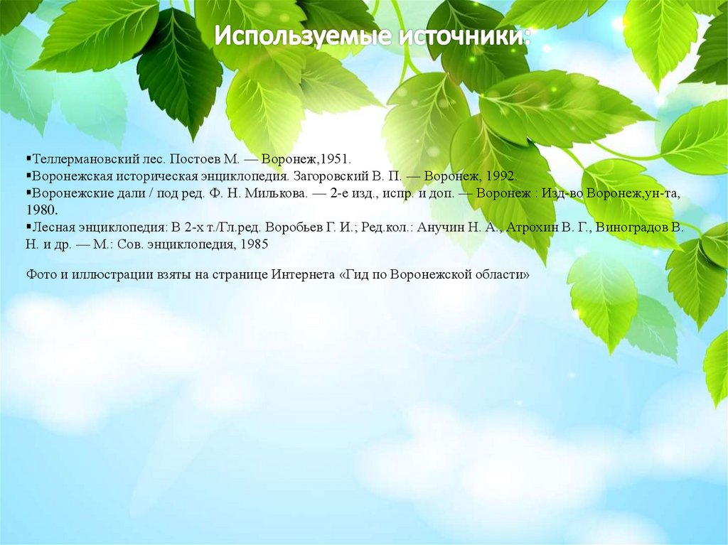 Теллермановский лес. Постоев М. — Воронеж,1951.Воронежская историческая энциклопедия. Загоровский В. П. — Воронеж, 1992.