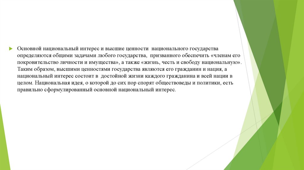 Основной национальный интерес и высшие ценности национального государстваопределяются общими задачами любого государства, призванного обеспечить «членам его
