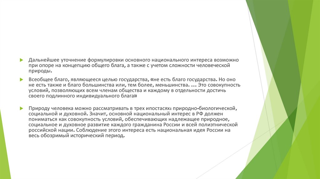 Дальнейшее уточнение формулировки основного национального интереса возможнопри опоре на концепцию общего блага, а также с учетом сложности человеческой