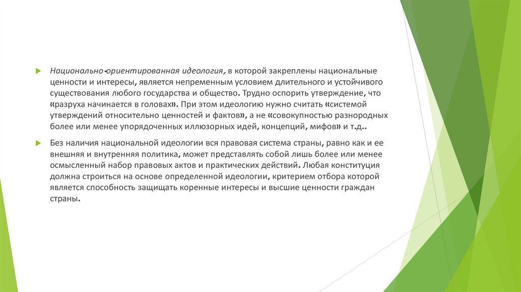 Национально-ориентированная идеология, в которой закреплены национальныеценности и интересы, является непременным условием длительного и устойчивого