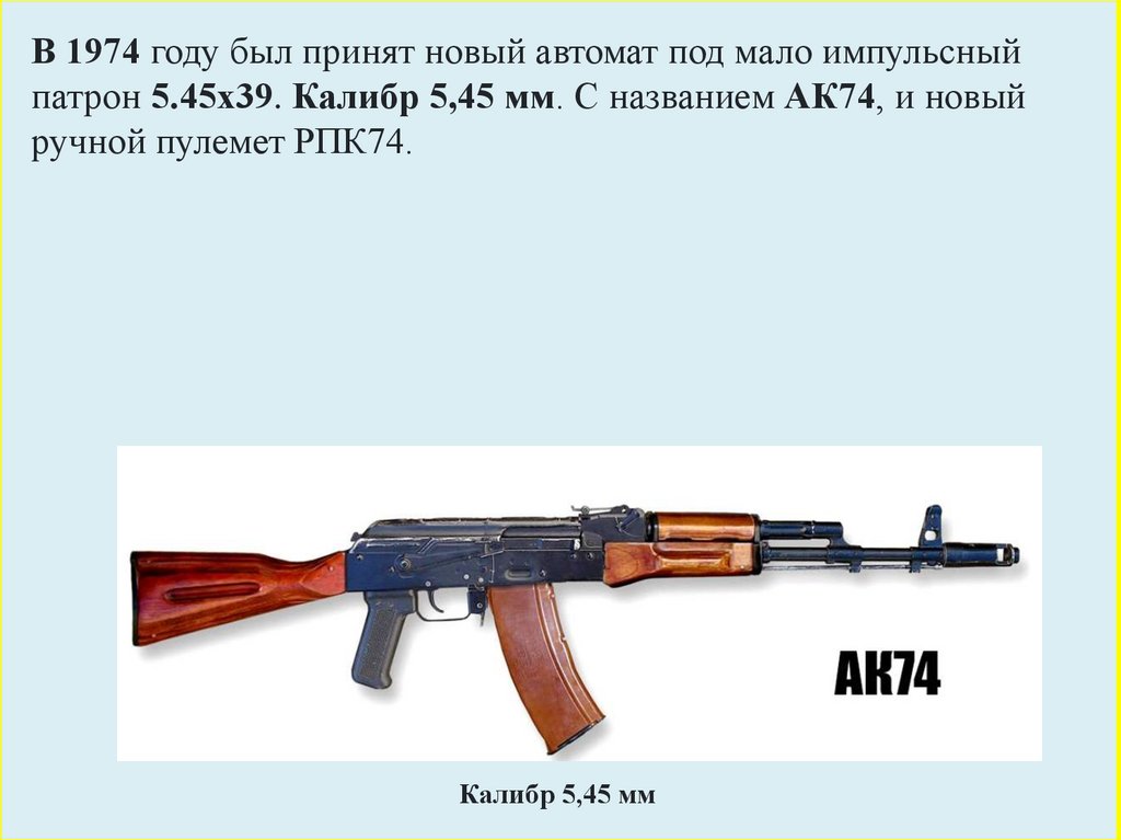 В 1974 году был принят новый автомат под мало импульсныйпатрон 5.45х39. Калибр 5,45 мм. С названием АК74, и новый