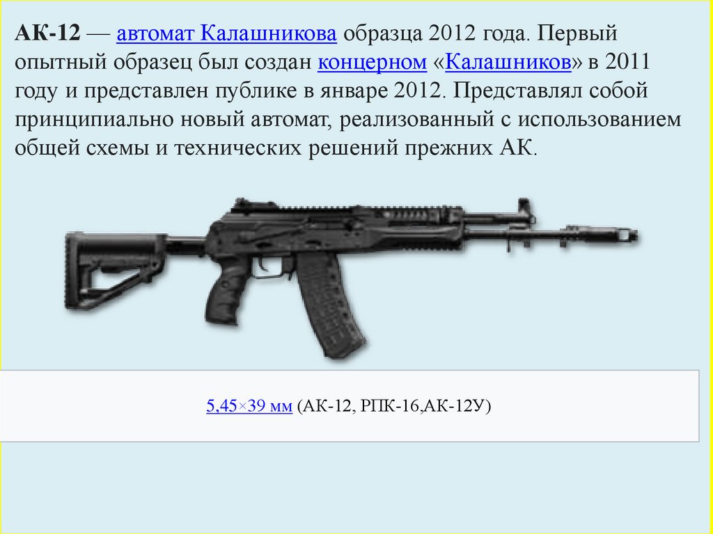 АК-12 — автомат Калашникова образца 2012 года. Первыйопытный образец был создан концерном «Калашников» в 2011