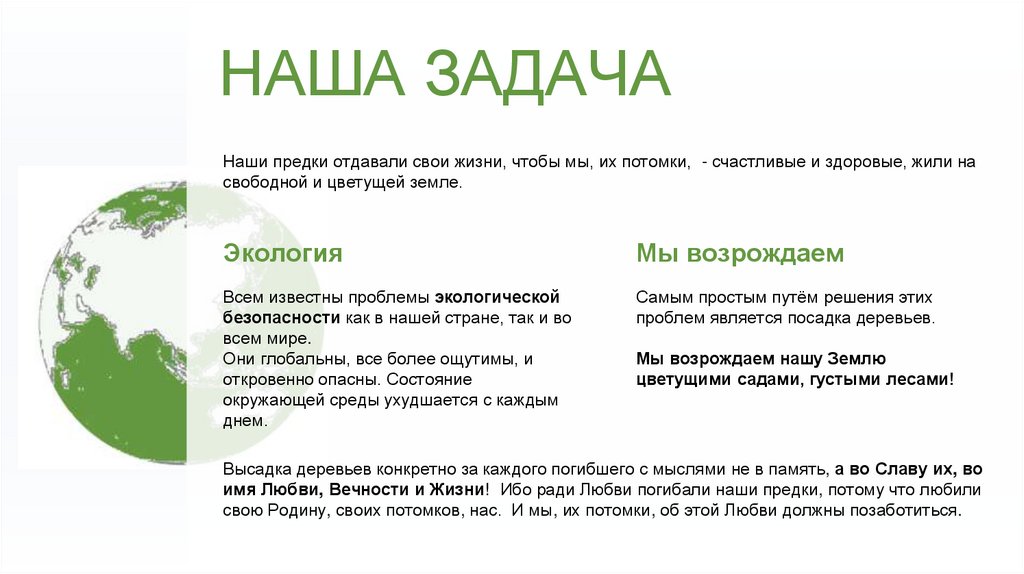 НАША ЗАДАЧАНаши предки отдавали свои жизни, чтобы мы, их потомки, - счастливые и здоровые, жили на