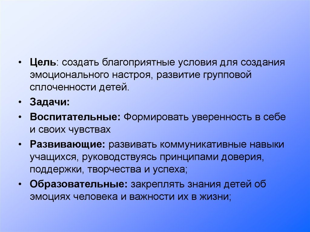 • Цель: создать благоприятные условия для созданияэмоционального настроя, развитие групповой
