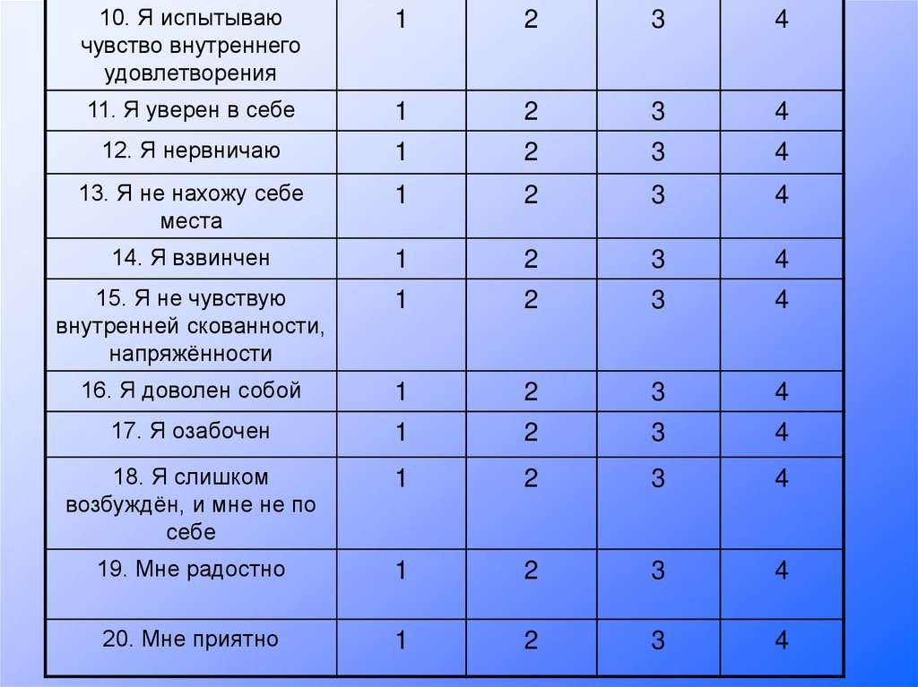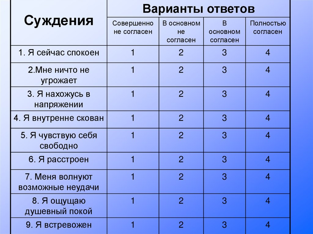 14. Результат: до 30 баллов – низкая тревожность; 31-45 – умеренная; 46 и более – высокая.