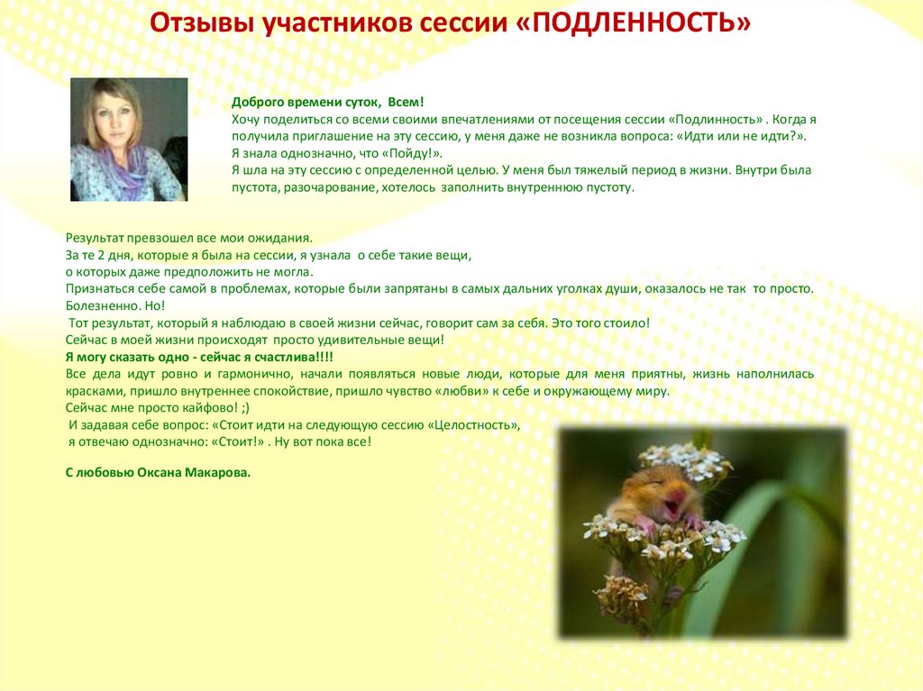 Рада поблагодарить всех участников нашей сессии «ПОДЛИННОСТЬ». Сказать , что в жизни