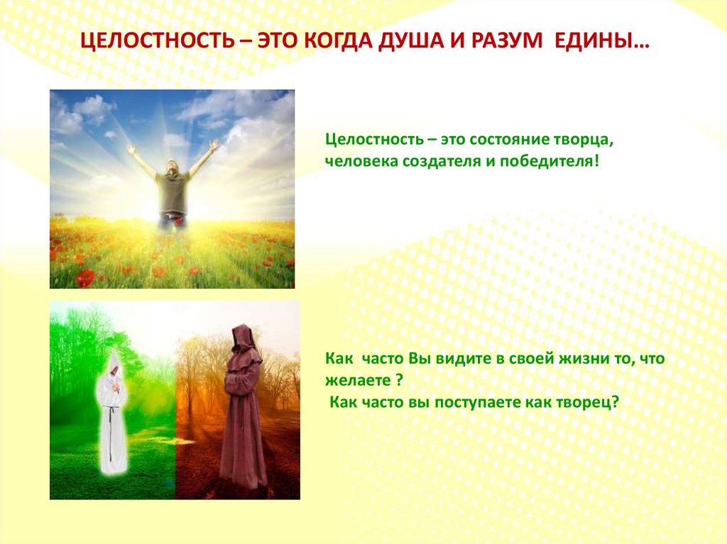 ЦЕЛОСТНОСТЬ – ЭТО КОГДА ДУША И РАЗУМ ЕДИНЫ…Целостность – это состояние творца,