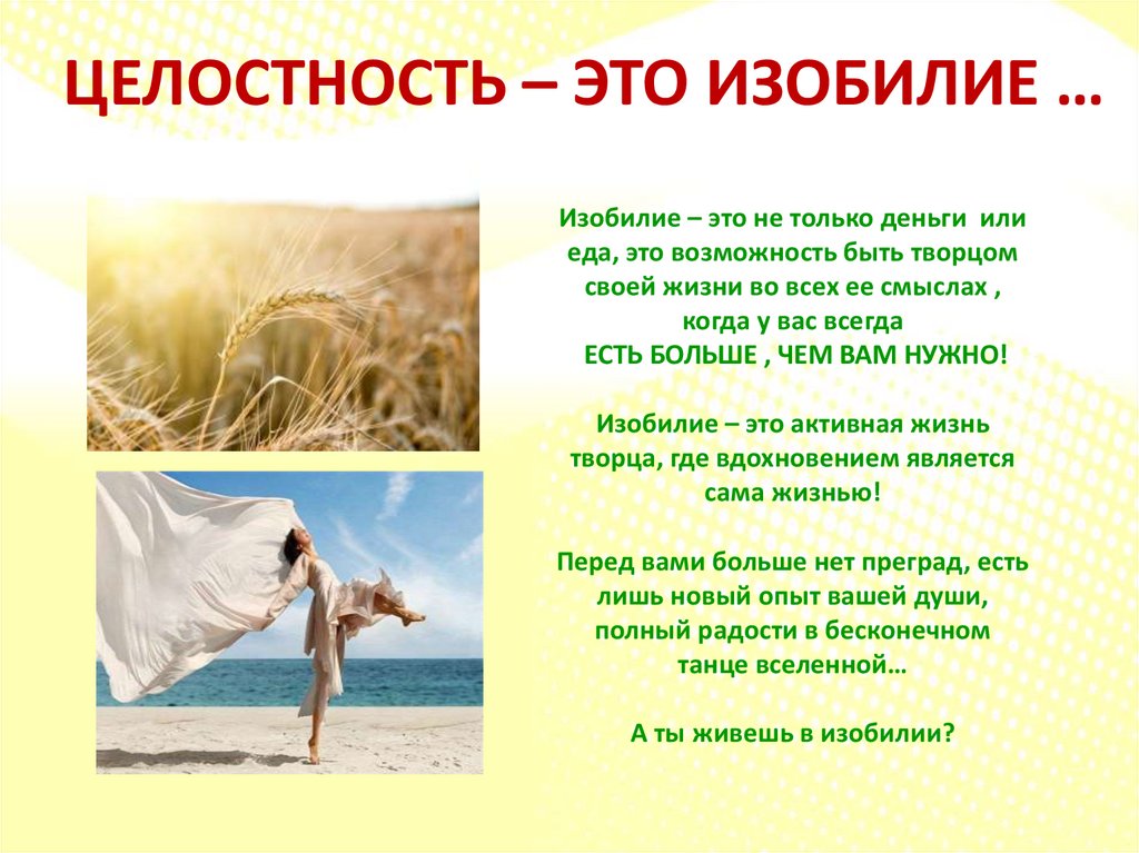 ЦЕЛОСТНОСТЬ – ЭТО ИЗОБИЛИЕ …Изобилие – это не только деньги или