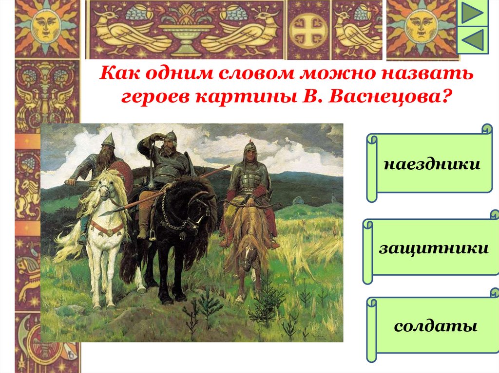 Как одним словом можно назватьгероев картины В. Васнецова?