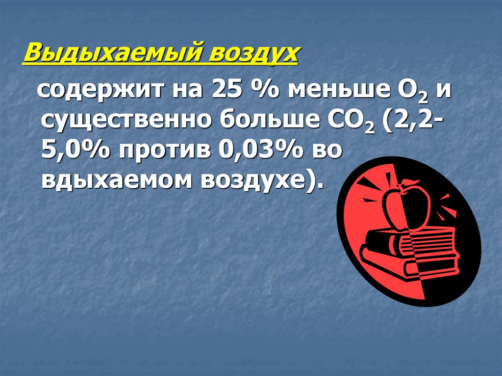 Выдыхаемый воздухсодержит на 25 % меньше О2 и