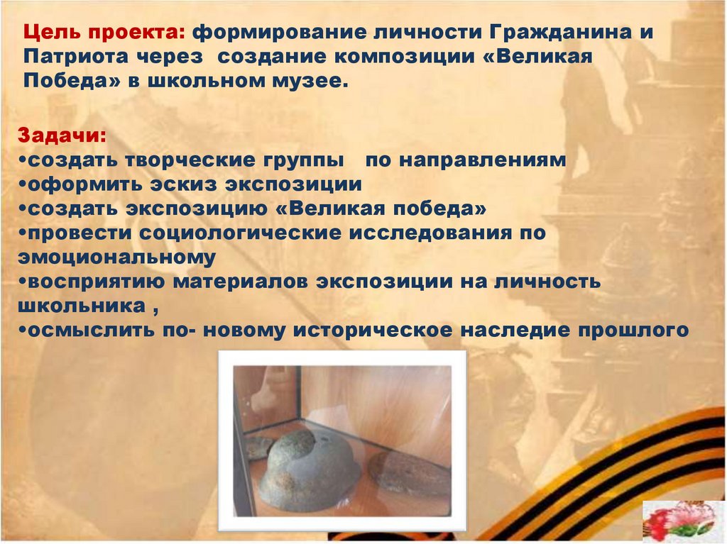 Итоги проектабудет создана экспозиция «Великая Победа» в школьном