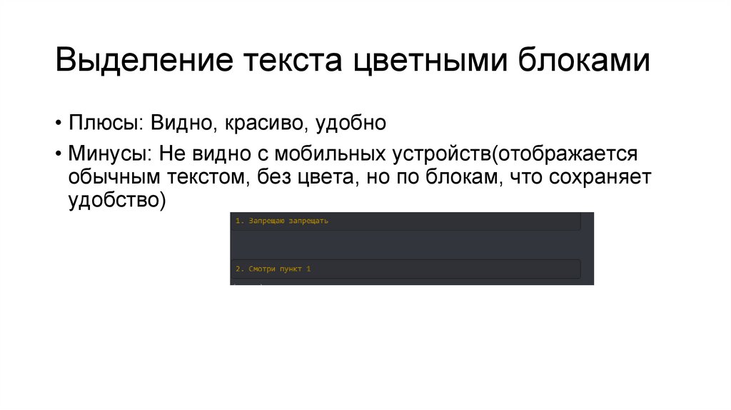 Выделение текста цветными блоками• Плюсы: Видно, красиво, удобно