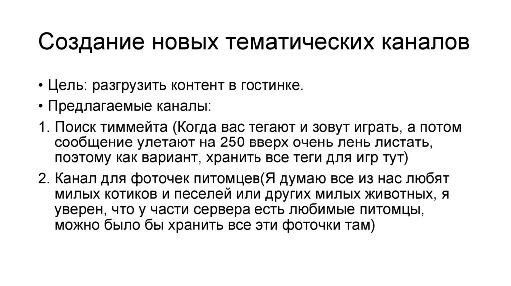 Создание новых тематических каналов• Цель: разгрузить контент в гостинке.