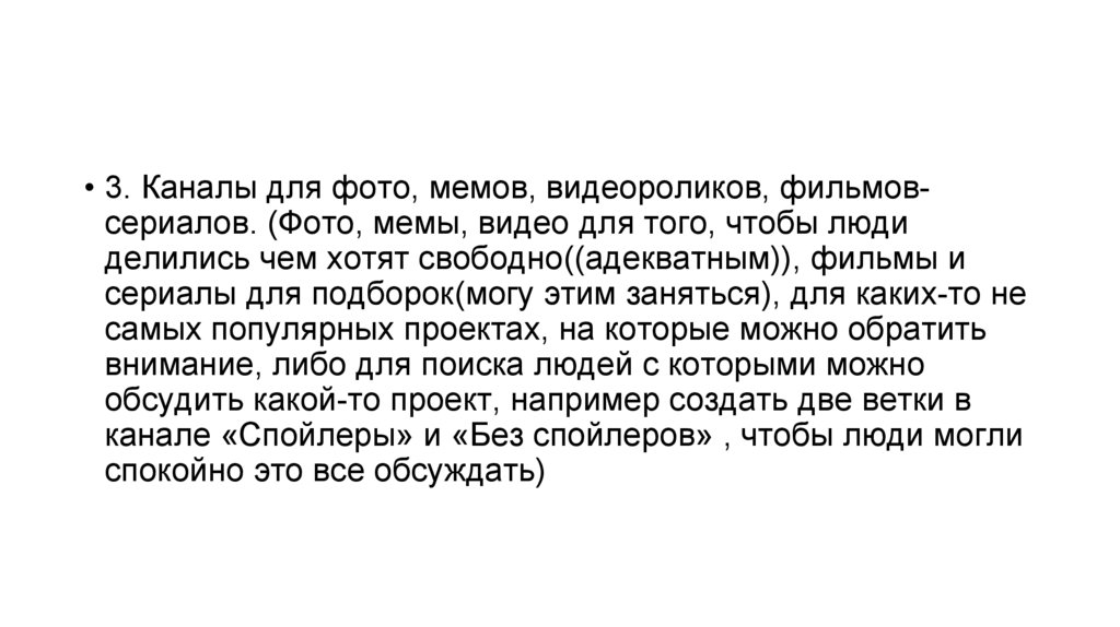 • 3. Каналы для фото, мемов, видеороликов, фильмовсериалов. (Фото, мемы, видео для того, чтобы людиделились чем хотят свободно((адекватным)), фильмы и