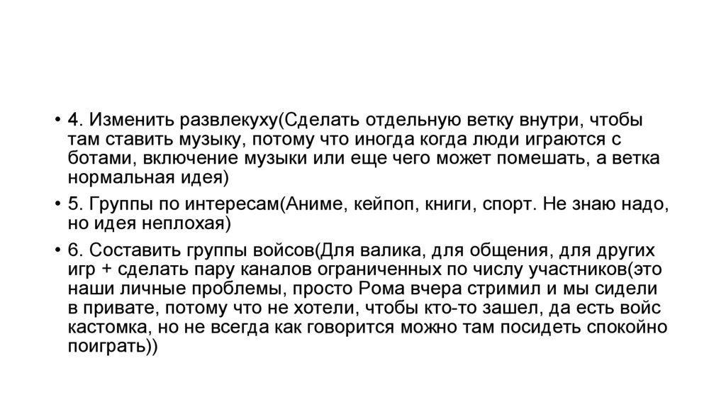 • 4. Изменить развлекуху(Сделать отдельную ветку внутри, чтобытам ставить музыку, потому что иногда когда люди играются с