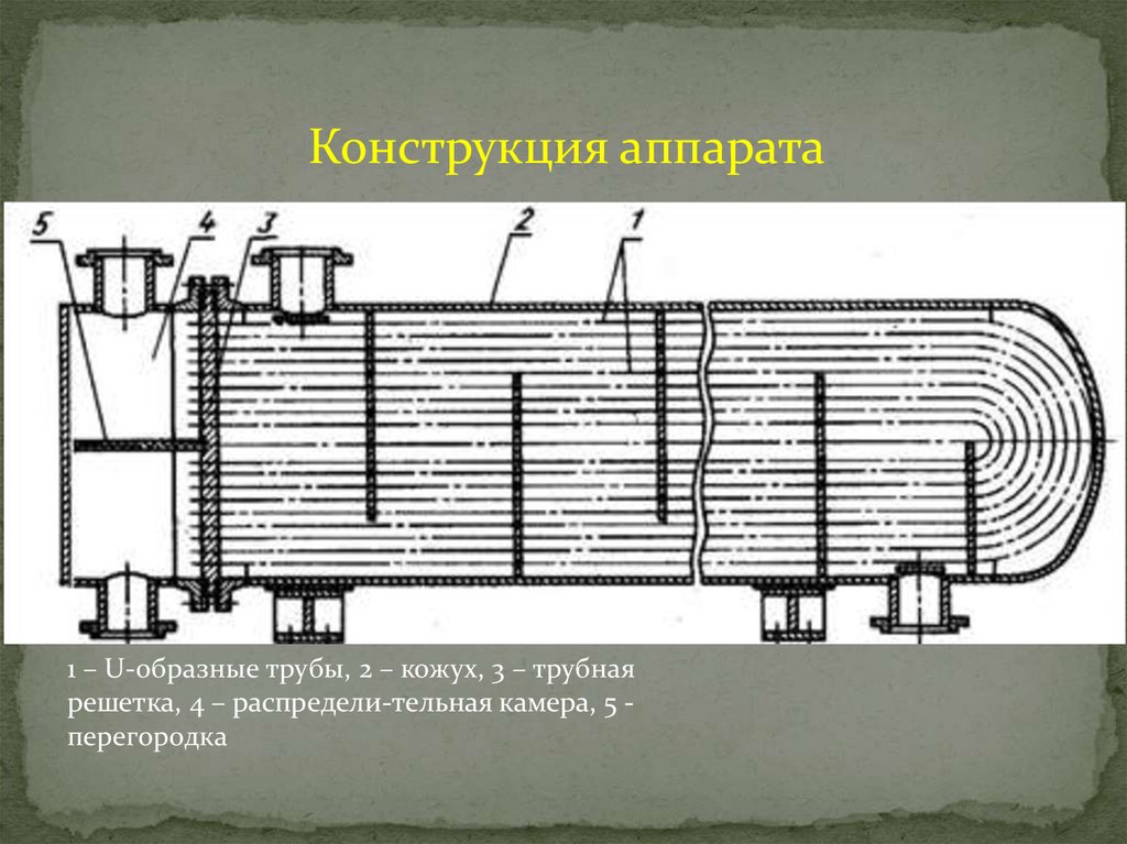 Конструкция аппарата1 – U-образные трубы, 2 – кожух, 3 – трубная