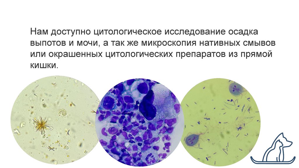 Нам доступно цитологическое исследование осадкавыпотов и мочи, а так же микроскопия нативных смывов