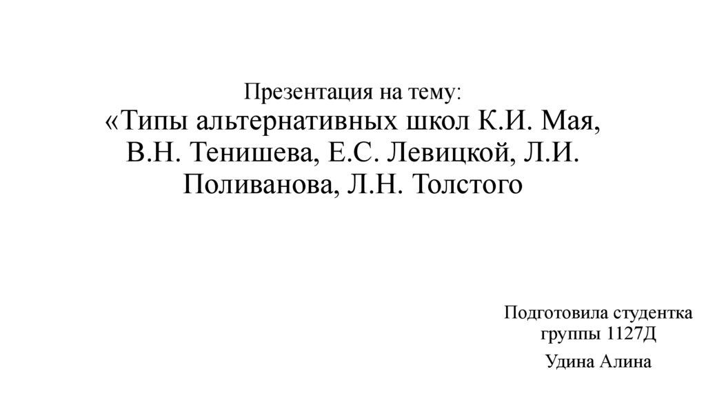 1. Презентация на тему: «Типы альтернативных школ К.И. Мая, В.Н. Тенишева, Е.С. Левицкой, Л.И. Поливанова, Л.Н. Толстого