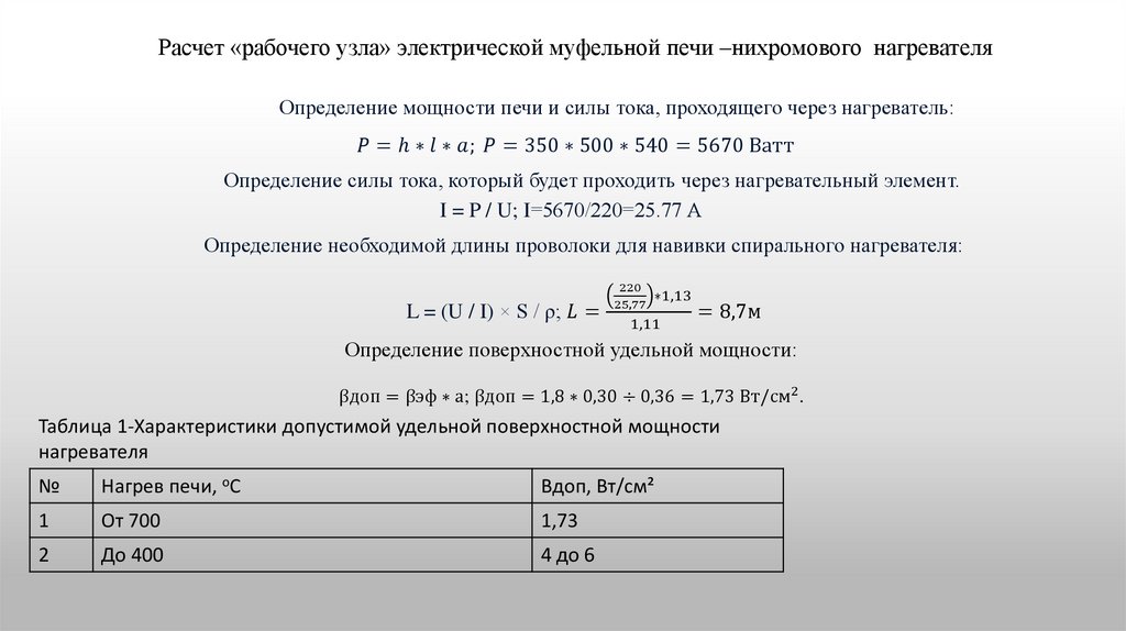 Расчет «рабочего узла» электрической муфельной печи –нихромового нагревателяОпределение мощности печи и силы тока, проходящего через нагреватель: