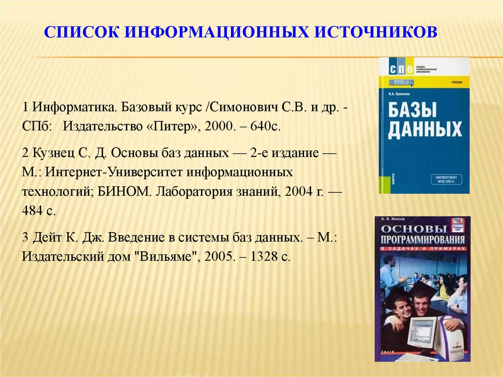 СПИСОК ИНФОРМАЦИОННЫХ ИСТОЧНИКОВ1 Информатика. Базовый курс /Симонович С.В. и др. СПб: Издательство «Питер», 2000. – 640с.