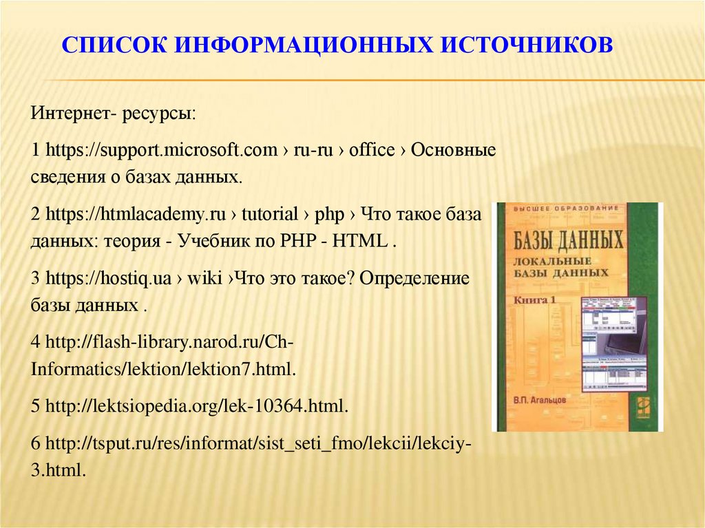 СПИСОК ИНФОРМАЦИОННЫХ ИСТОЧНИКОВИнтернет- ресурсы: