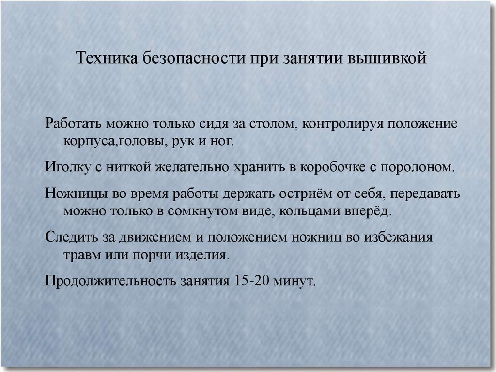 Техника безопасности при занятии вышивкойРаботать можно только сидя за столом, контролируя положение