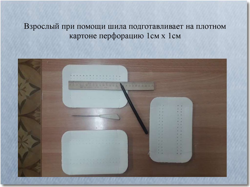 Взрослый при помощи шила подготавливает на плотномкартоне перфорацию 1см х 1см