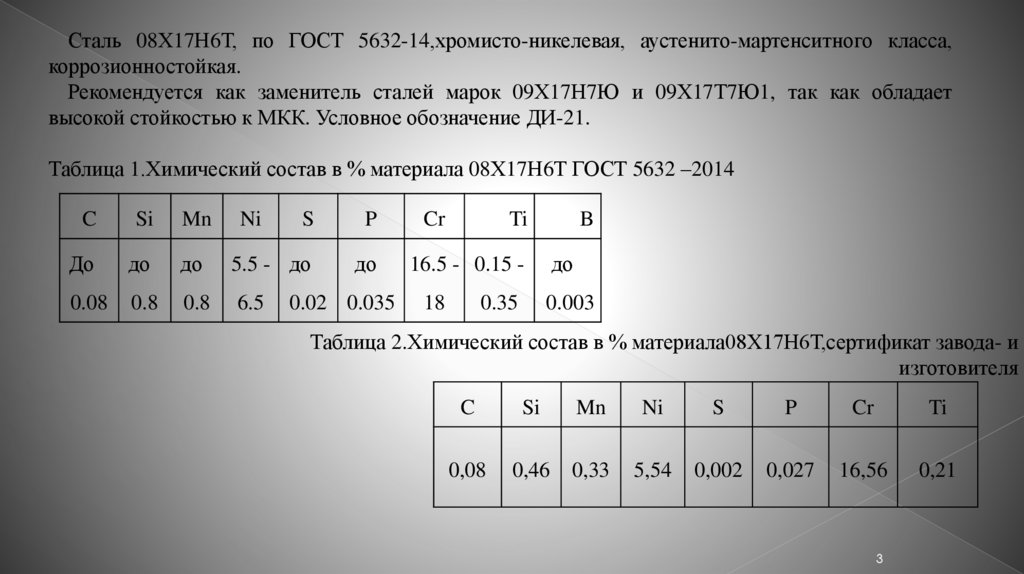 Таблица 1.Химический состав в % материала 08Х17Н6Т ГОСТ 5632 –2014