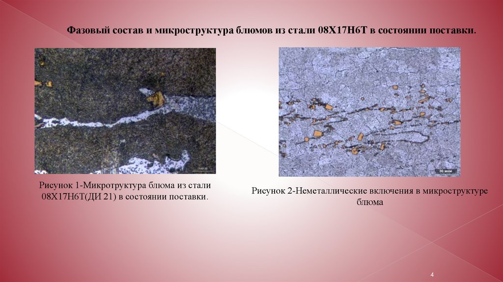 Фазовый состав и микроструктура блюмов из стали 08Х17Н6Т в состоянии поставки.10 МКМ