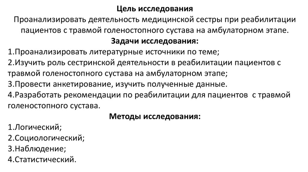 Анализ деятельности медицинской сестры при реабилитации пациентов с травмой голеностопного сустава на амбулаторном этапе