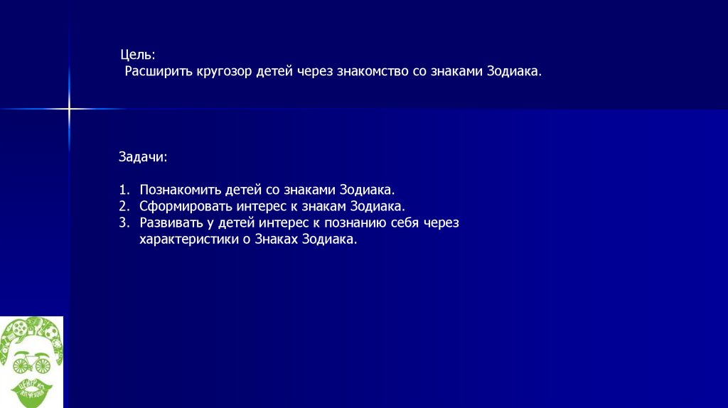 Цель:Расширить кругозор детей через знакомство со знаками Зодиака.