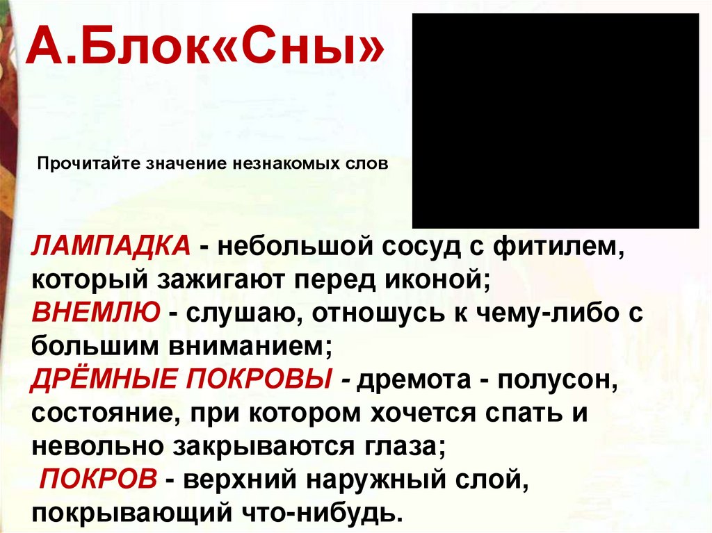 А.Блок«Сны»Прочитайте значение незнакомых слов