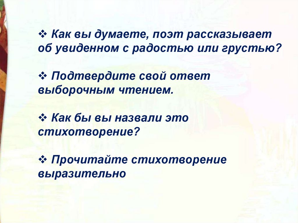 Как вы думаете, поэт рассказываетоб увиденном с радостью или грустью?