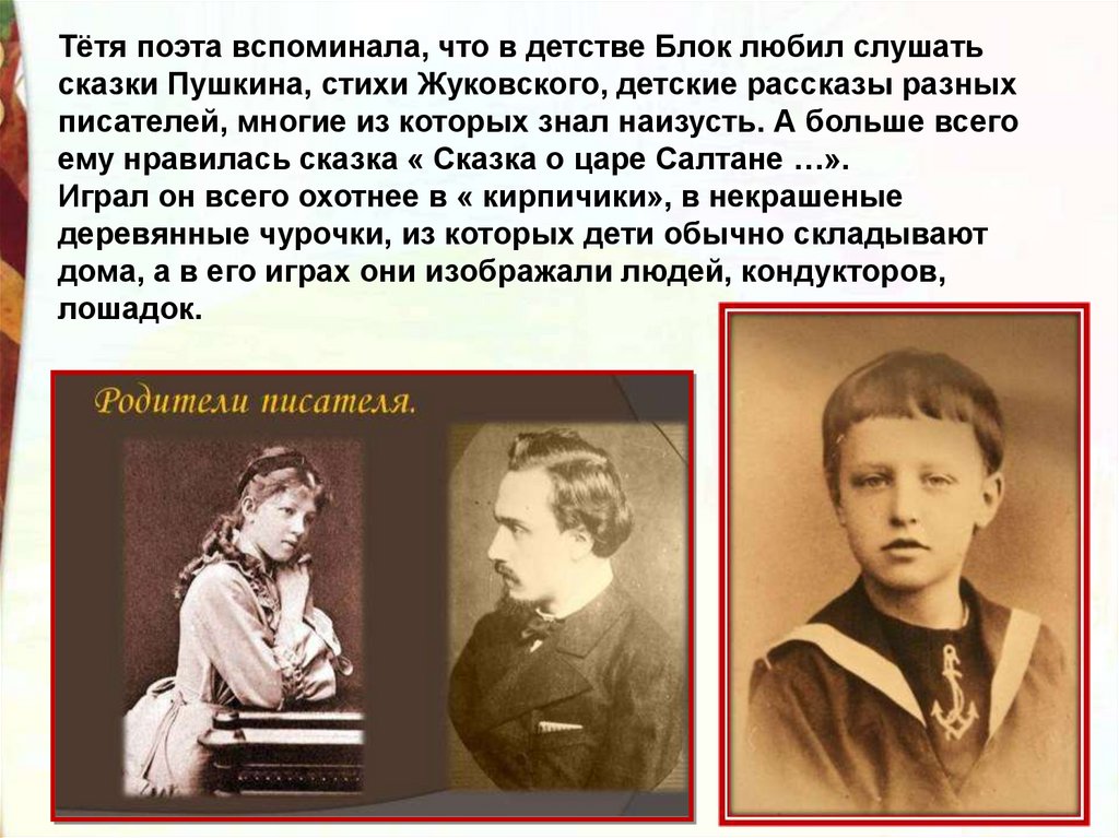 Тётя поэта вспоминала, что в детстве Блок любил слушатьсказки Пушкина, стихи Жуковского, детские рассказы разных