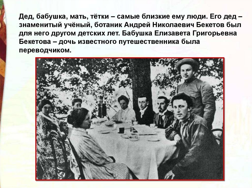 Дед, бабушка, мать, тётки – самые близкие ему люди. Его дед –знаменитый учёный, ботаник Андрей Николаевич Бекетов был