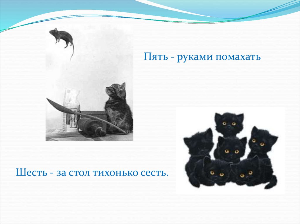 Пять - руками помахатьШесть - за стол тихонько сесть.