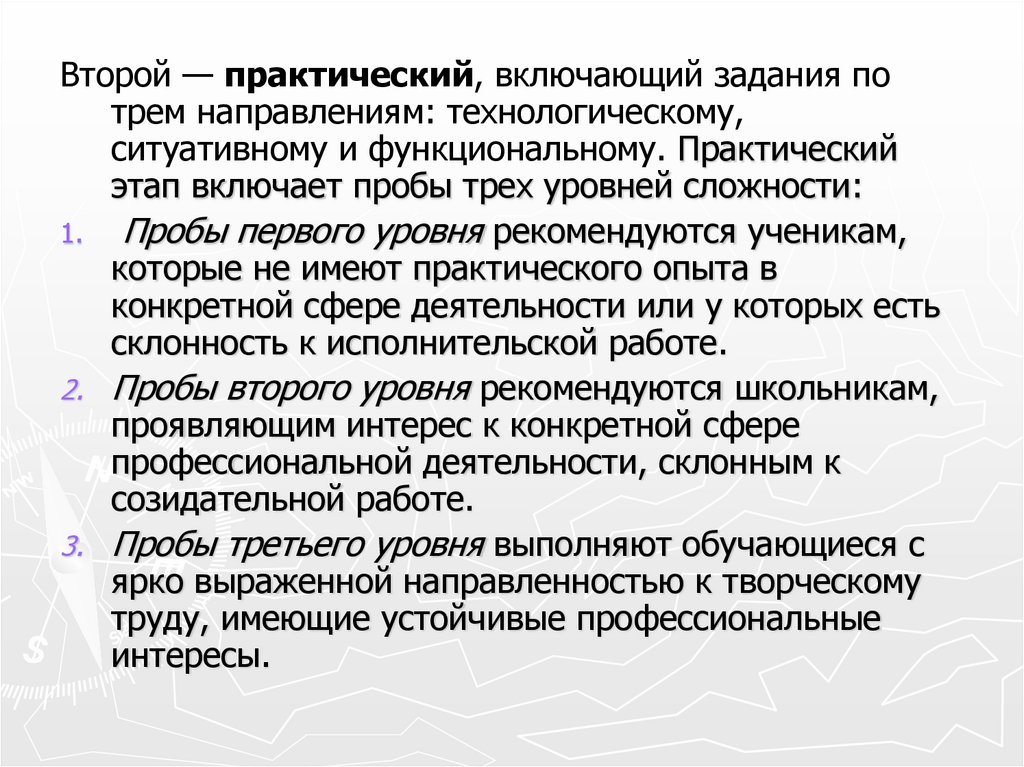 Второй — практический, включающий задания потрем направлениям: технологическому,