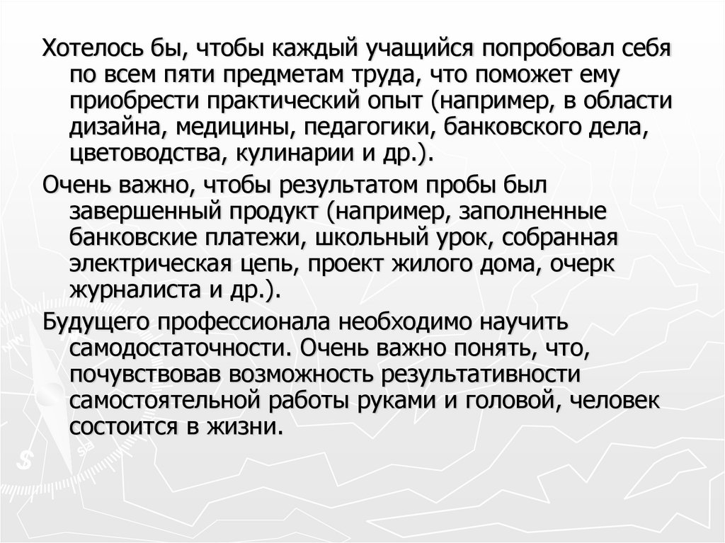 Хотелось бы, чтобы каждый учащийся попробовал себяпо всем пяти предметам труда, что поможет ему