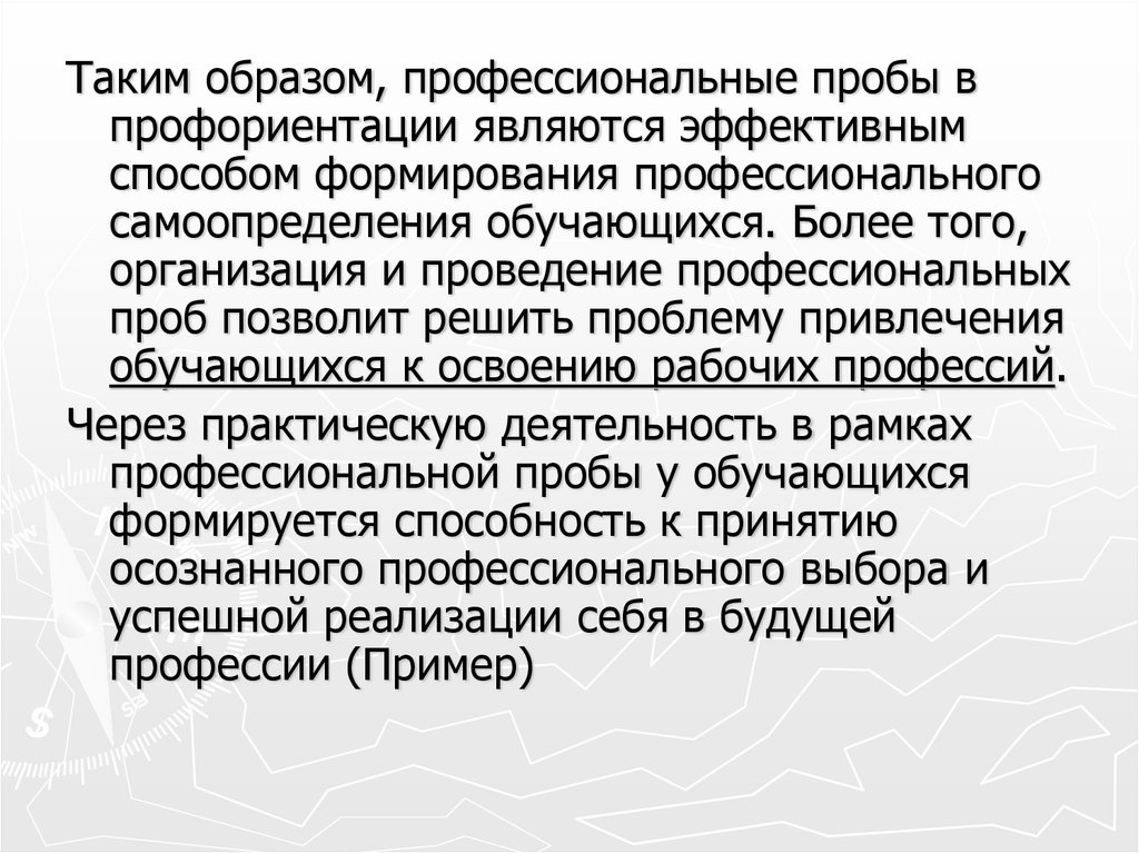 Таким образом, профессиональные пробы впрофориентации являются эффективным