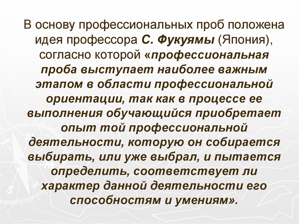 В основу профессиональных проб положенаидея профессора С. Фукуямы (Япония),