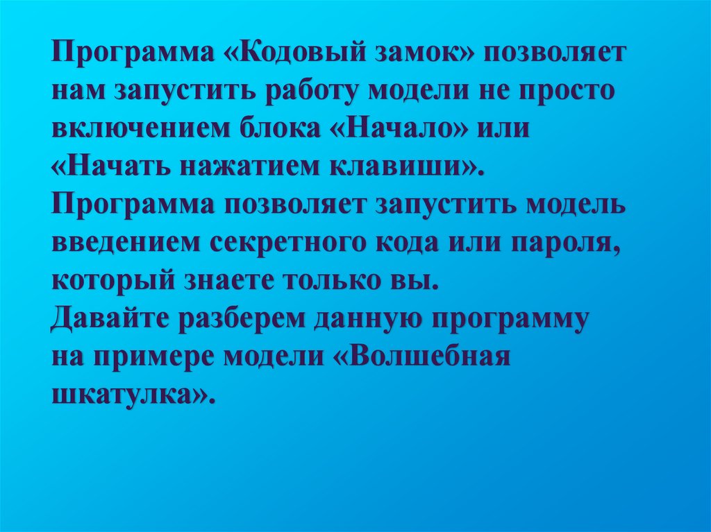 Программа «Кодовый замок» позволяетнам запустить работу модели не просто