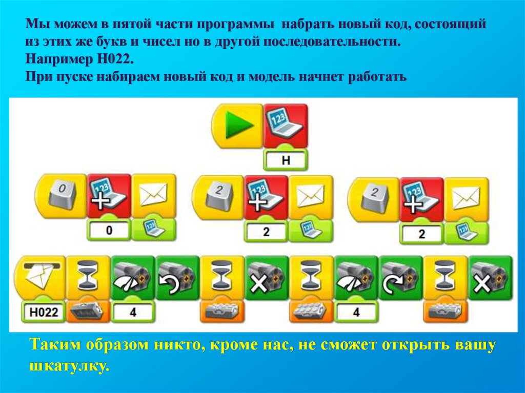Мы можем в пятой части программы набрать новый код, состоящийиз этих же букв и чисел но в другой последовательности.