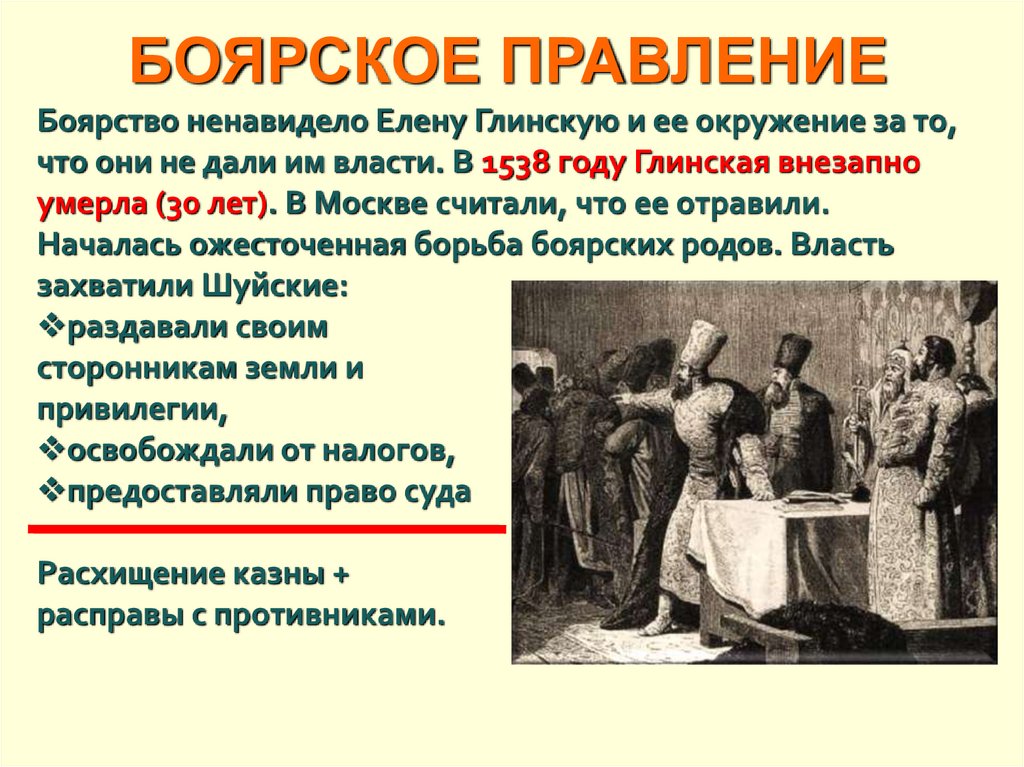 БОЯРСКОЕ ПРАВЛЕНИЕБоярство ненавидело Елену Глинскую и ее окружение за то,