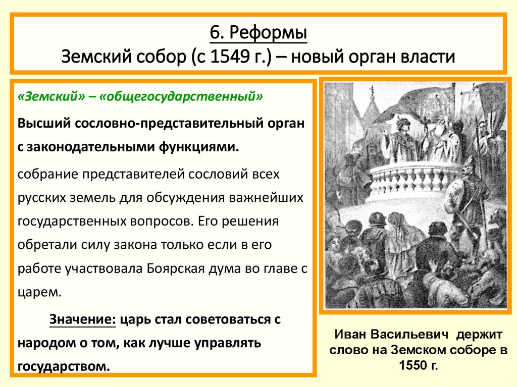 6. РеформыЗемский собор (с 1549 г.) – новый орган власти