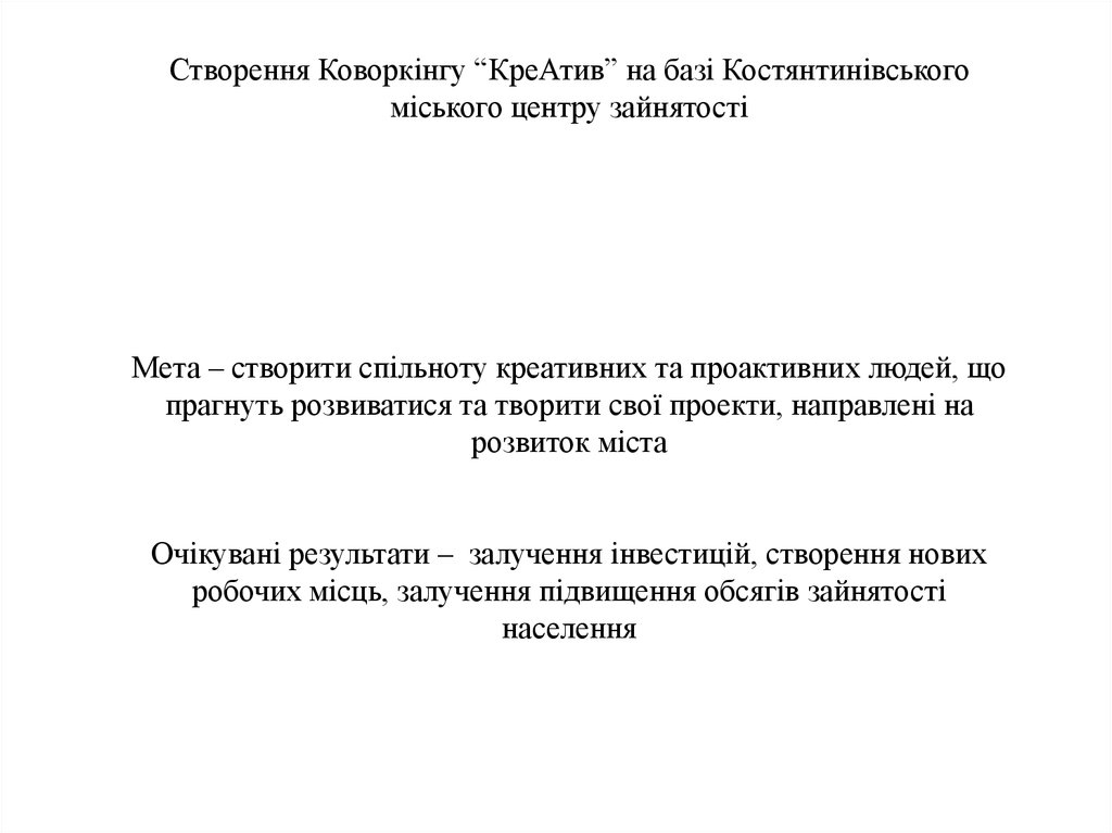 Створення Коворкінгу “КреАтив” на базі Костянтинівськогоміського центру зайнятості
