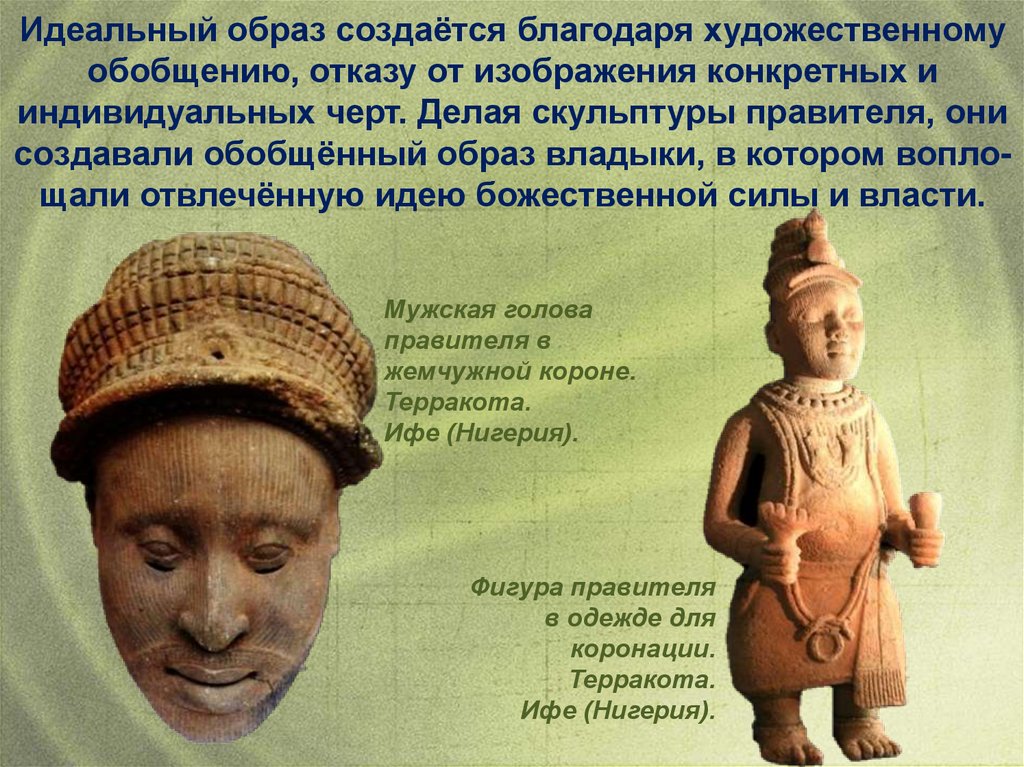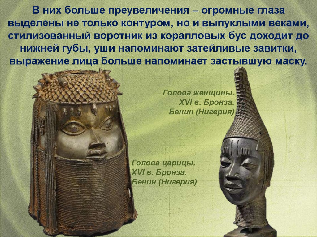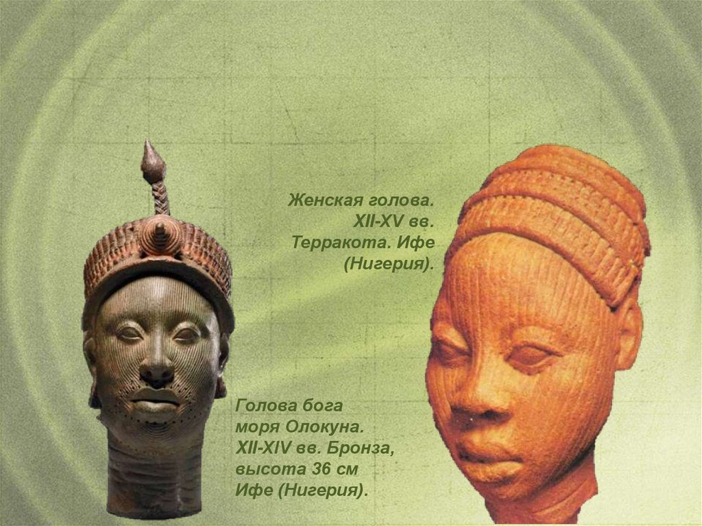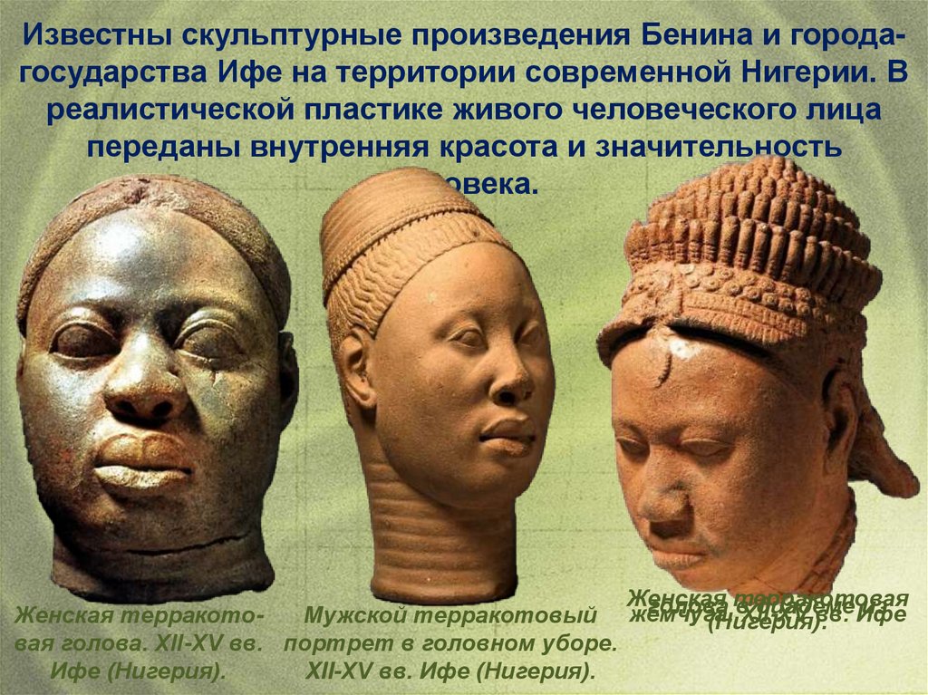 Известны скульптурные произведения Бенина и городагосударства Ифе на территории современной Нигерии. Вреалистической пластике живого человеческого лица