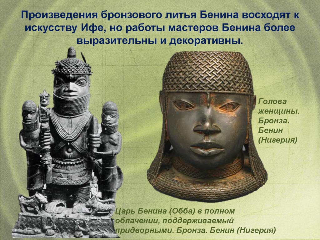 Произведения бронзового литья Бенина восходят кискусству Ифе, но работы мастеров Бенина более